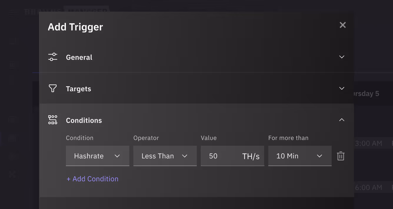 Set automated triggers for real-time ASIC metrics like hashrate, temperature, power and more. Reduce reaction times, minimize human error, and ensure continuous safe and stable operation.