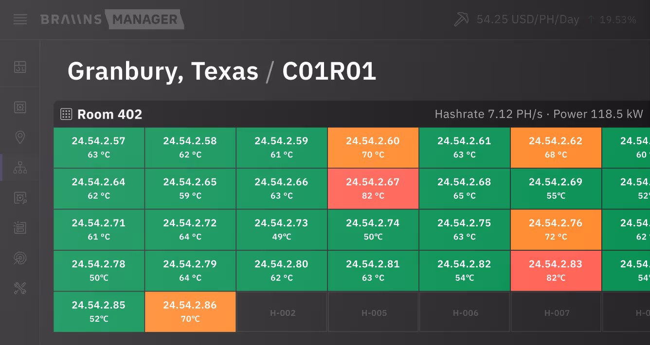 Improve your on-site orientation with a visual layout of your entire fleet. Instantly identify thermal hotspots, locate problematic ASICs, and take action faster to ensure maximum uptime.
